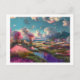 A serene landscape unfolds under a sky painted with soft, fluffy clouds reflecting the warm hues of the ground. Pink and purple blossoms blanket the land, creating a dreamlike view with a calming river meandering through the vibrant terrain toward distant mountains.