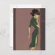 Blue-purple frames give the depth of this picture. Added with a violet background, the lady stands in a brighter space. The lady, however, looks sideward, which gives more distance and mystery. In a dark green dress, the figure is depicted slim and elegant, as if something flashed over her mind to stop her progress.