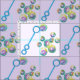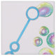 Design features an original marker illustration of a blue bubble wand blowing pretty rainbow-coloured iridescent soap bubbles, on a purple background.