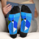 My original artwork is featured on these fun socks, consisting of an abstract style argyle pattern in mostly blue tones, showcasing geometric shapes. These playful crazy socks are considered a sustainable product and are printed with water-based inks. Cozy and comfy and make a great gift. One size truly fits all.