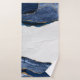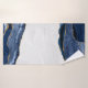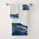 This custom bathroom towel set features a luxurious natural stone design. The background is a soft grey marble pattern. The hand and bath towels have navy blue agate with faux gold glitter accents printed on either end. The washcloth has the agate pattern printed on one side.