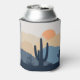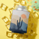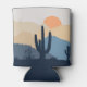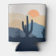 Mexican desert at sunrise illustration with sun, mountains and cactus decoration in navy blue, orange, blue and beige colours on pastel grey background