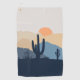 Mexican desert at sunrise illustration with sun, mountains and cactus decoration in navy blue, orange, blue and beige colours on pastel grey background