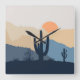 Mexican desert at sunrise illustration with sun, mountains and cactus decoration in navy blue, orange, blue and beige colours on pastel grey background