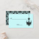 This aqua blue and black damask chandelier place card matches the wedding invitation shown below. If you require any other matching items, please email your request to niteowlstudio@gmail.com.
