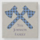 Perfect for your family, this personalized design features a grayish blue background with a black and grey plaid crossed axe. A great housewarming present, place your order today!