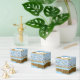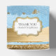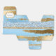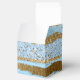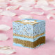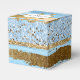Chic wedding or special occasion favour gift box, with graphics of a blue and gold foil and glitter looking abstract striped look. A gold and white decorative plaque, on the lid of the box, has custom text ready to personalize for your event.