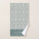 Rustic blue trellis print bath towel set personalized with your name monogram or other text. Please note that the subtle linen texture is part of the printed design and the product is not made of real linen fabric. Use the design tools to add your own text and photos to create a unique one of a kind design. The perfect touch for your modern farmhouse bathroom decor!