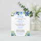 This beautiful and elegant wedding details card can be customized with important information for your guests such as wedding reception, hotel accommodation, transportation, directions, dress attire, itinerary, registry and more. The design features watercolor baby blue and navy blue flowers with foliage. The text combines handwritten script and serif fonts for a stylish and modern look. This is perfect for a spring or summer rustic wedding.