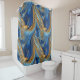 A shower curtain with a pattern of flowing fractal waves, like shimmering water, in shades of light to dark blue, and orange
