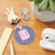 This cute and preppy design has a white anchor silhouette is in a light pink frame on a background of diagonal, nautical navy blue stripes.