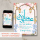 Celebrate Eid with this stunning floral card. It features a dark chocolate-colored Islamic arch surrounded by lush blue forget-me-nots and pink lilies. Delicate hanging lanterns complete this high-end, artistic look.
