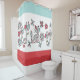 A cute and colourful shower curtain for cat lovers features a cat of blue and white with red polka dots as well as pretty flowers of red, white, and blue with polka dots.