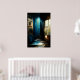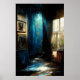 This is a painting of a room with sentimental photos on the wall and blue and gold tapestry highlighted by sunlight coming through the window. Inspired by Oscar Peterson's rendition of the classic "Blue and Sentimental: by Count Basie. Flowing paint strokes compliment the tone of the song. Great poster for any basement jazz club, man cave or she shed. Creative gift idea for the jazz or blues lover in your life.