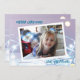 Personalized Christmas cards. Pretty white, blue and silver Christmas lights photo holiday card.