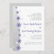 Blue and silver grey white snowflake wedding invitation. It showcases a waved band in silver grey with stars and blue elegant snowflakes. Text in blue. A stylish design perfect for your winter, December or Christmas wedding.