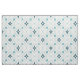 This fabric features a repeating pattern of various shapes in shades of blue and teal.