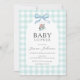 Blue and White Buffalo Check Plaid Baby Shower Invitation. Baby boy. Blue watercolor bow. Flower bouquet.