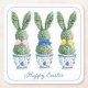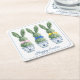 These Easter paper party coasters feature cute bunny rabbit green topiaries with pink, blue and yellow bows in blue and white chinoiserie flowerpots. Personalize the holiday message with your choice of special text.