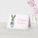 This Easter greeting card features a cute bunny rabbit green topiary with pink bow in a blue and white chinoiserie flowerpot. Personalize the holiday messages on the front and inside with your choice of special text.