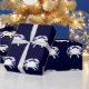 White crab shape against a dark nautical blue. The species is a blue crab.