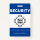 This custom security guard employee identification badge features a sample logo in the center. The title "SECURITY" is printed above it in bold white font over a blue background. You can include your company, business or organization name or additional text below the logo, as well as an employee name. The back of the badge features additional employee or company information printed over a blue background, with a sample barcode placed at the bottom. You can replace the scan code with your own, or another image.