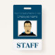 This custom photo identification badge features a sample photograph in the centre, over an ocean blue coloured background. The title "STAFF" is printed below it in bold to signify the individual as a staff member for your event or organization. You can include your company name or additional text above the image, as well as an employee name. The back of the badge features additional employee or company information printed over a matching blue background, with a sample barcode placed at the bottom. You can replace the scan code with your own, or another image, such as a custom logo.