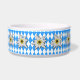 German inspired pet bowl done in the traditional Oktoberfest blue and white diamond checked pattern, with graphics of the white Alpine flowers called Edelweiss.