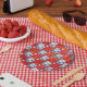 Blue and White Festive Soccer Ball Pattern on Red Paper Plate