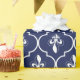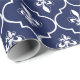 This decorative wrapping paper with a French flair features a bi-directional pattern of modern white fleur-de-lis symbols inside of a quatrefoil design on a dark blue background. The background colour can be changed to any other colour you prefer.