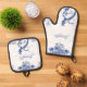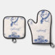 Blue and White Floral China Pattern with Bird Oven Mitt & Pot Holder Set