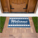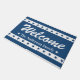 This blue and white doormat features a border of patriotic stars on the top and bottom with 'Welcome' in a large white decorative script. Personalize by adding your name, family name or special text. Perfect for the summer season and July 4th holiday.