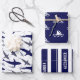 Add a touch of the ocean to the birthday party of your little boy with this custom blue and white shark pattern set of wrapping paper sheets. Sheets have cute sharks swimming in the sea and your little one's first name on blue and white stripes.