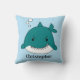 Cute cartoon blue and white shark with black ovals for eyes and big sharp pointed teeth. He is blowing white bubbles on a blue background. Below the shark is a template to add your name or other text.