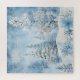 A watercolor image of a beautiful all blue and white winter image of tree, snowflakes and flowers