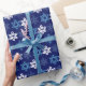 Here’s a fun holiday design with a delightful snowflake pattern. The pattern is made up of blue and white snowflakes on a dark blue background.