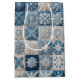 A quilt showcases intricate patterns resembling snowflakes, each block featuring unique blue and white designs