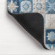 A quilt showcases intricate patterns resembling snowflakes, each block featuring unique blue and white designs