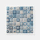 A quilt showcases intricate patterns resembling snowflakes, each block featuring unique blue and white designs