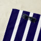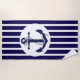 This roomy beach towel features sharp, crisp navy blue and white stripes. In the centre, of the towel, there is a white circle, with a navy blue anchor.