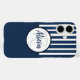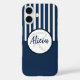 Simple, classic, and stylish, this iPhone case features vertical, navy blue and white stripes, with a wide, blue colour block at the bottom. A round badge holds your name and monogram.