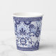 This paper cup design features a traditional blue and white Mexican talavera style tile pattern.
