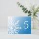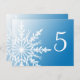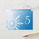 These festive Blue and White Winter Snowflake Table Numbers can be customized for your December, January or February winter wonderland theme marriage reception, bridal shower or engagement party. These classy custom wintery table number cards feature intricate white snowflakes with a blue gradient background.