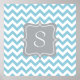 A blue and white chevron zig zag pattern has a light grey monogram frame with customizable initial.