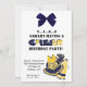 Cute birthday party invitation for the little girl who likes cheerleading. It features a blue and yellow cheer dress, pom-pom, and megaphone in the bottom right corner. A graphic of a blue bow hangs from the top. You customize the text.