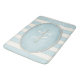 This custom bath mat has a pale ivory monogram in an oval frame on a background of broad stripes in pale blue and antique white.