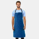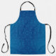 "Blue apron with a subtle circular pattern. Top image shows the apron spread out, displaying its design. Bottom image features a person wearing the apron, over a light blue shirt, smiling at the camera."