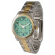 This men's watch has a mid-century modern design of arrows in two shades of blue on a field of seafoam green.