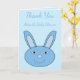 This awesome baby shower thank you card features a digital art image of a blue bunny face with pale blue eyes and nose and big ears. It has a lovely big smile. A great design for celebrating Spring or Easter. A cute way to thank your baby shower guests or reveal the gender of the baby. There is custom text on the front and inside allowing you to fully personalize the design.
