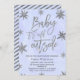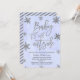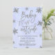 This winter themed baby shower invitation design features a blue watercolor image background and faux silver foil calligraphy heading and snowflakes. This simple but sweet winter themed baby shower invitation is a cute way to invite guests to a baby boy's upcoming baby shower.